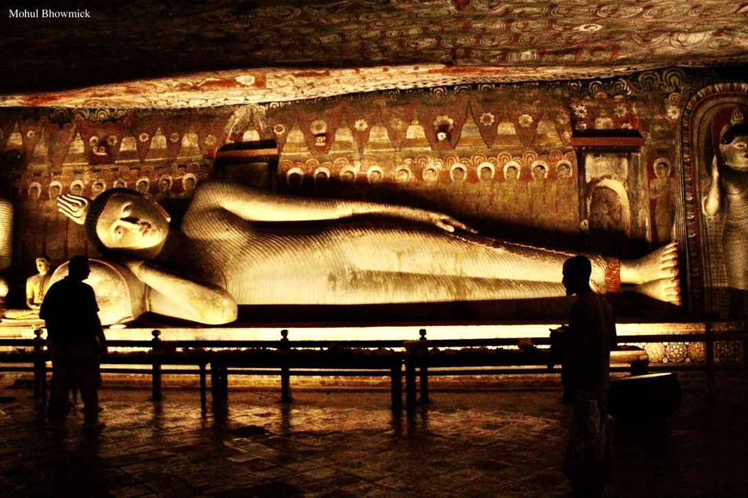 The recumbent Buddha idol carved inside the temple, reminiscent of the one seen in Polonnaruwa.