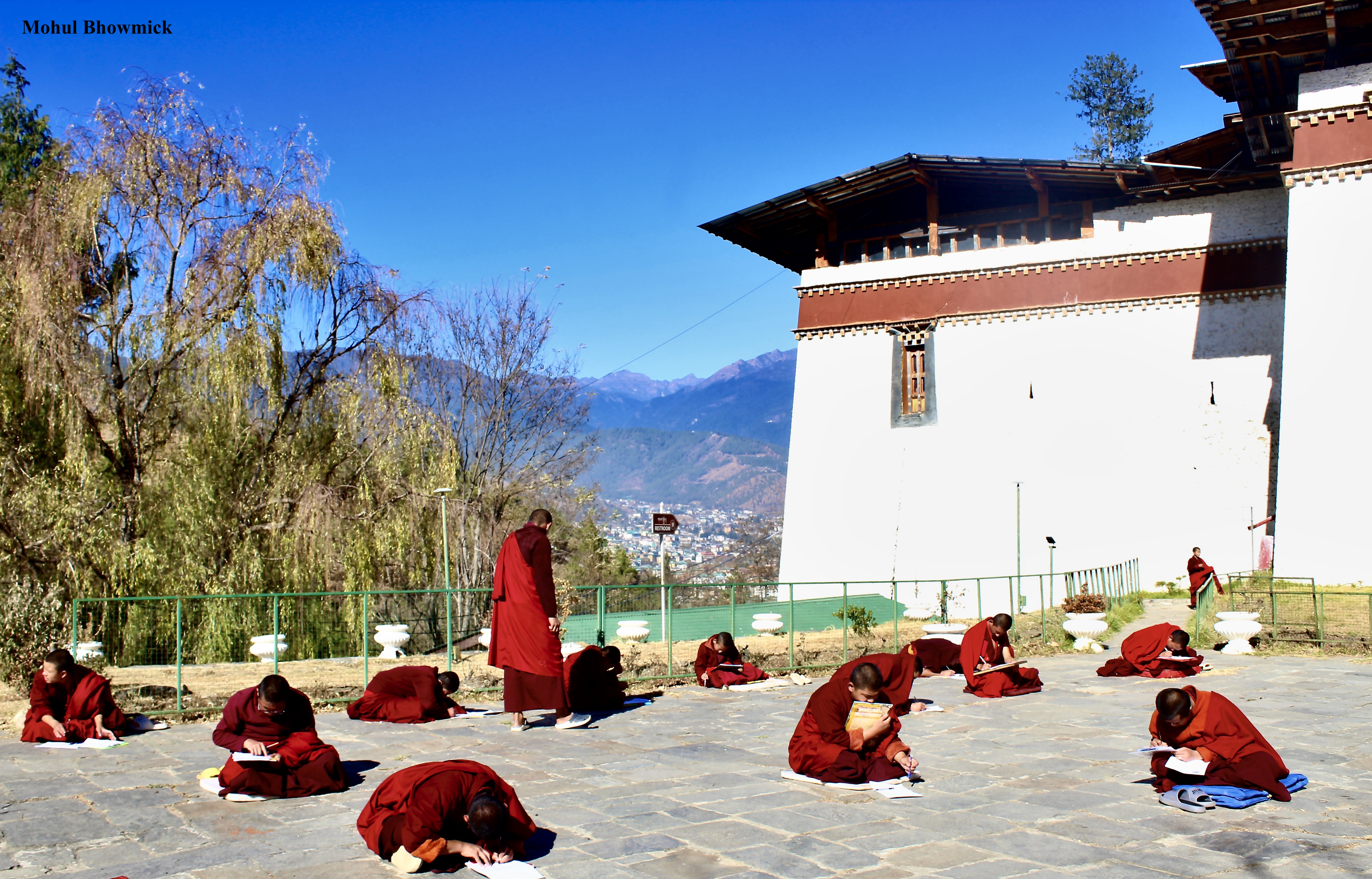 A group of young monks, or lamas, taking their annual examinations outside Simtokha Dzong.
