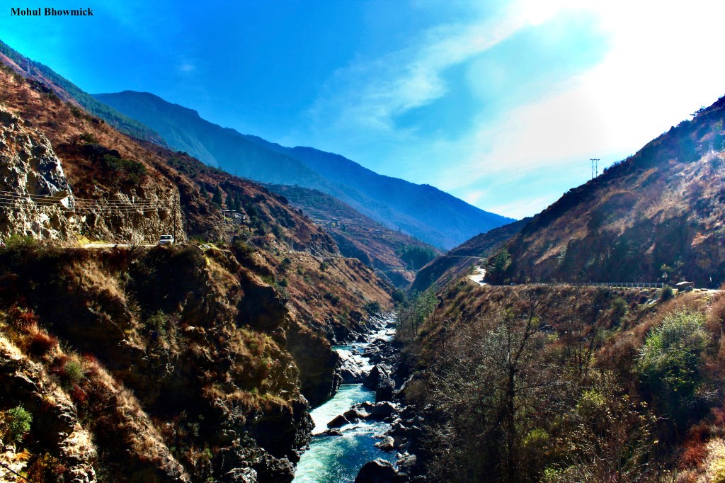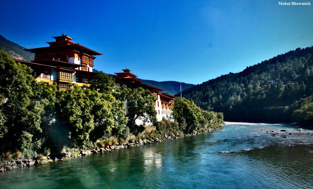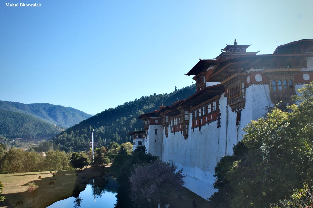 This post is dedicated to the valley of Punakha in central Bhutan, which is dominated by its eponymous dzong. The dzong, or fortress, which also serves as the headquarters of temporal and spiritual power of the district, is an imposing structure made all the more imposing with the gentle Mo Chhu river flowing past.
