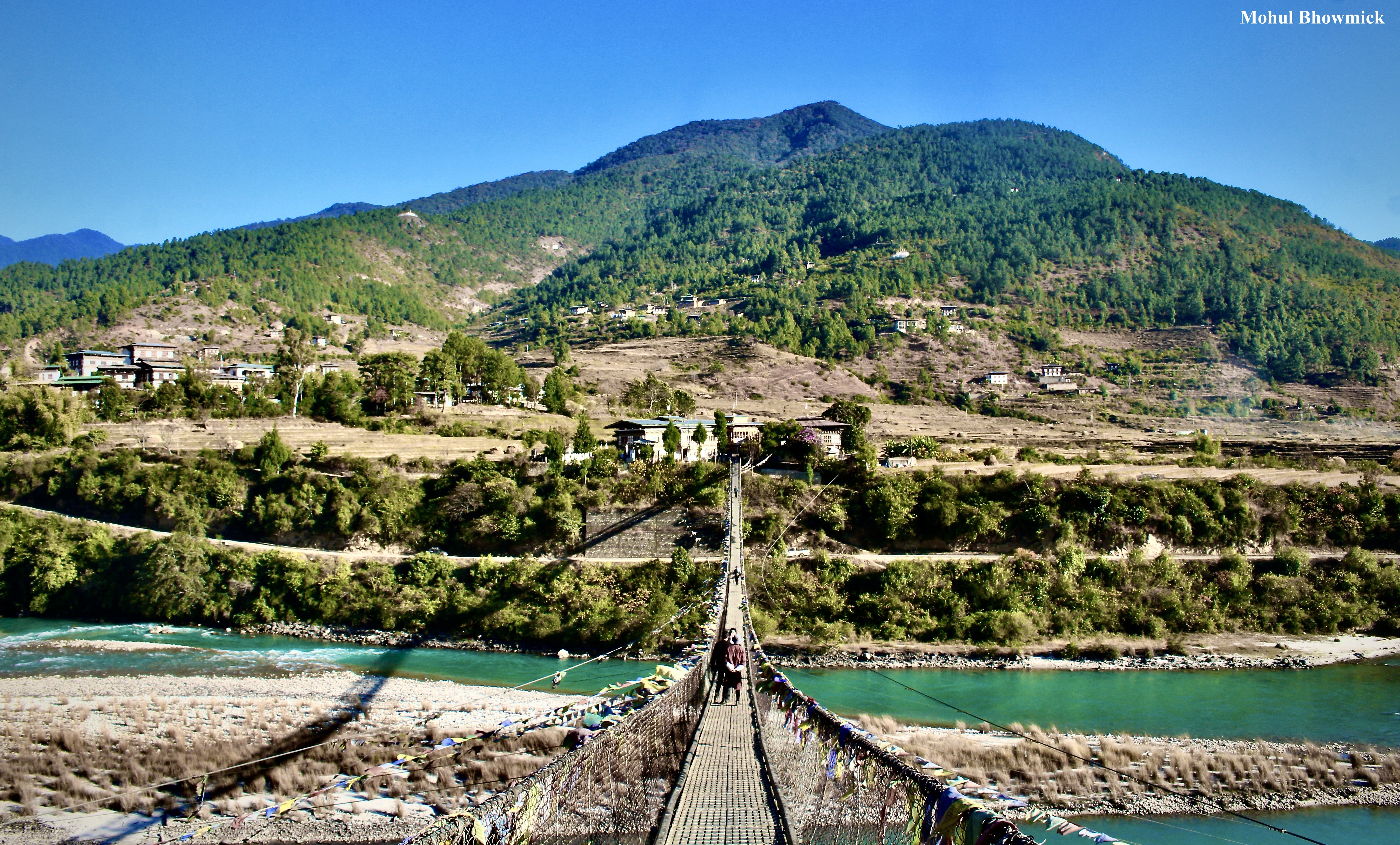 A trip to Punakha is seldom complete without visiting the suspension bridge spanning the Po Chhu river, bypassing the hill that separates the dzong from the river. The two rivers – Po Chhu (male) and Mo Chhu (female) meet at a confluence not a ways off from the dzong and from the Puna Tsang Chhu river.
