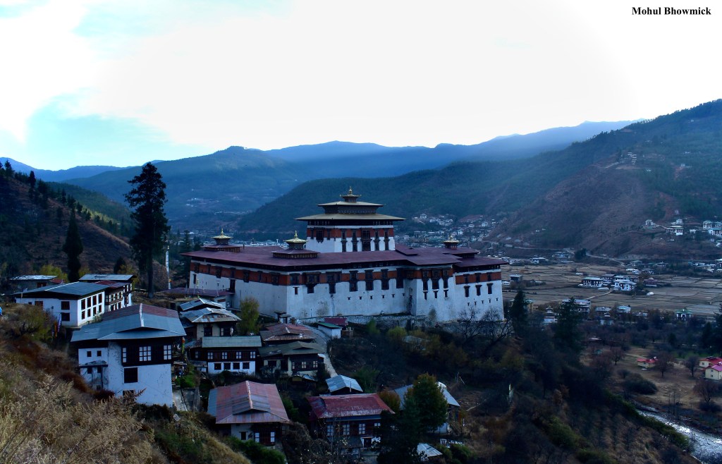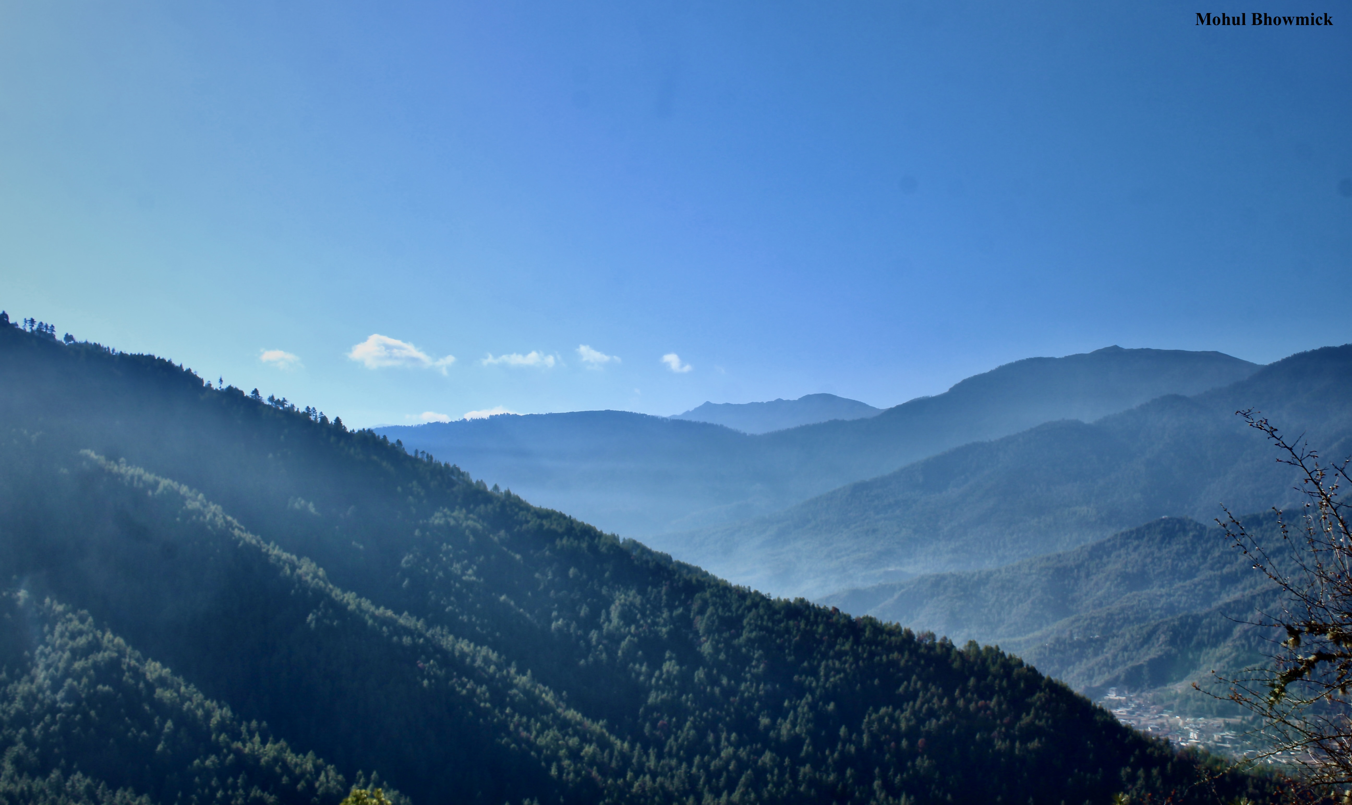 The valley of Paro lies pristine while the distant rolling hills abound to the north.