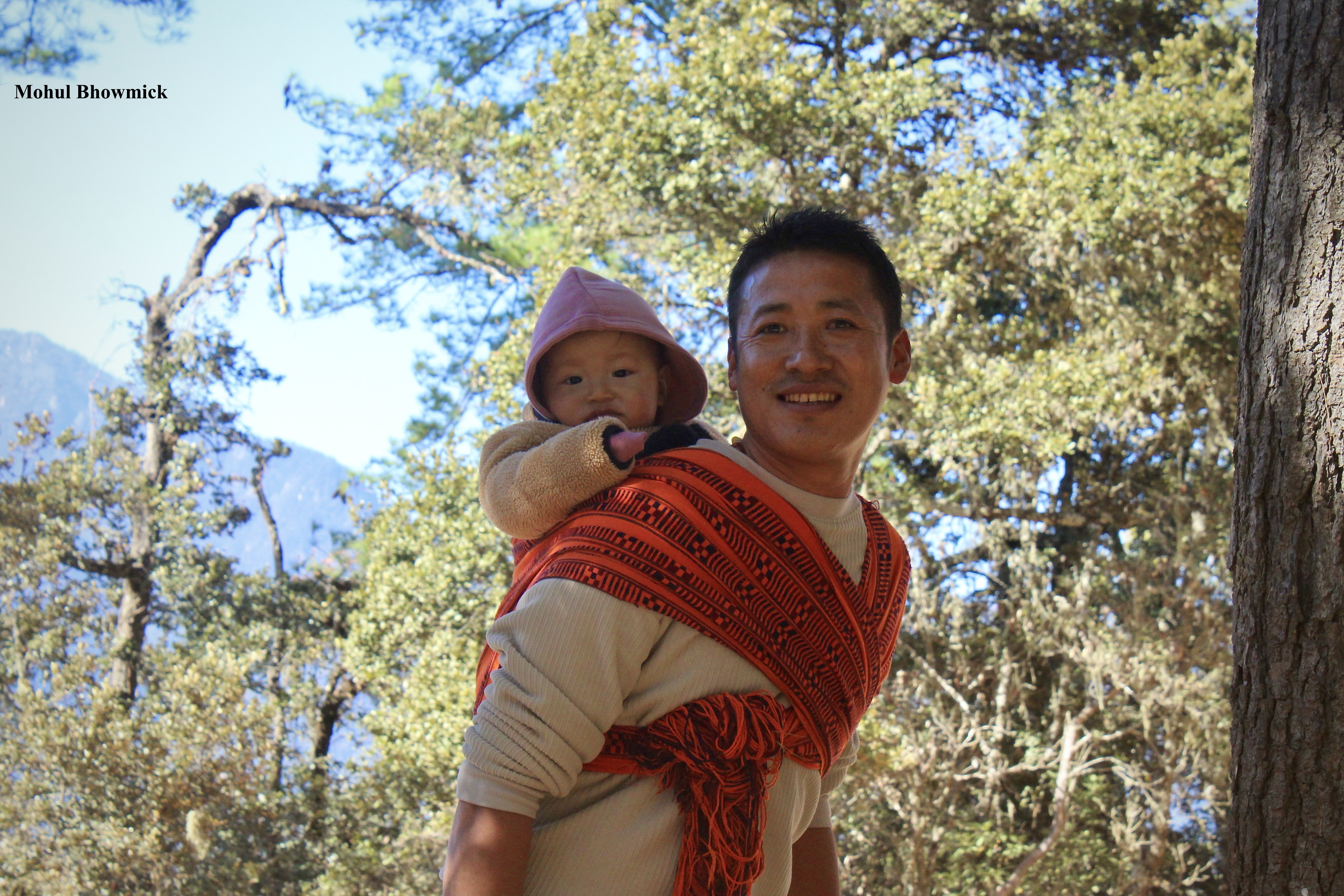 A cheerful father with his baby strapped on his back making the arduous trek to the Tiger’s Nest.