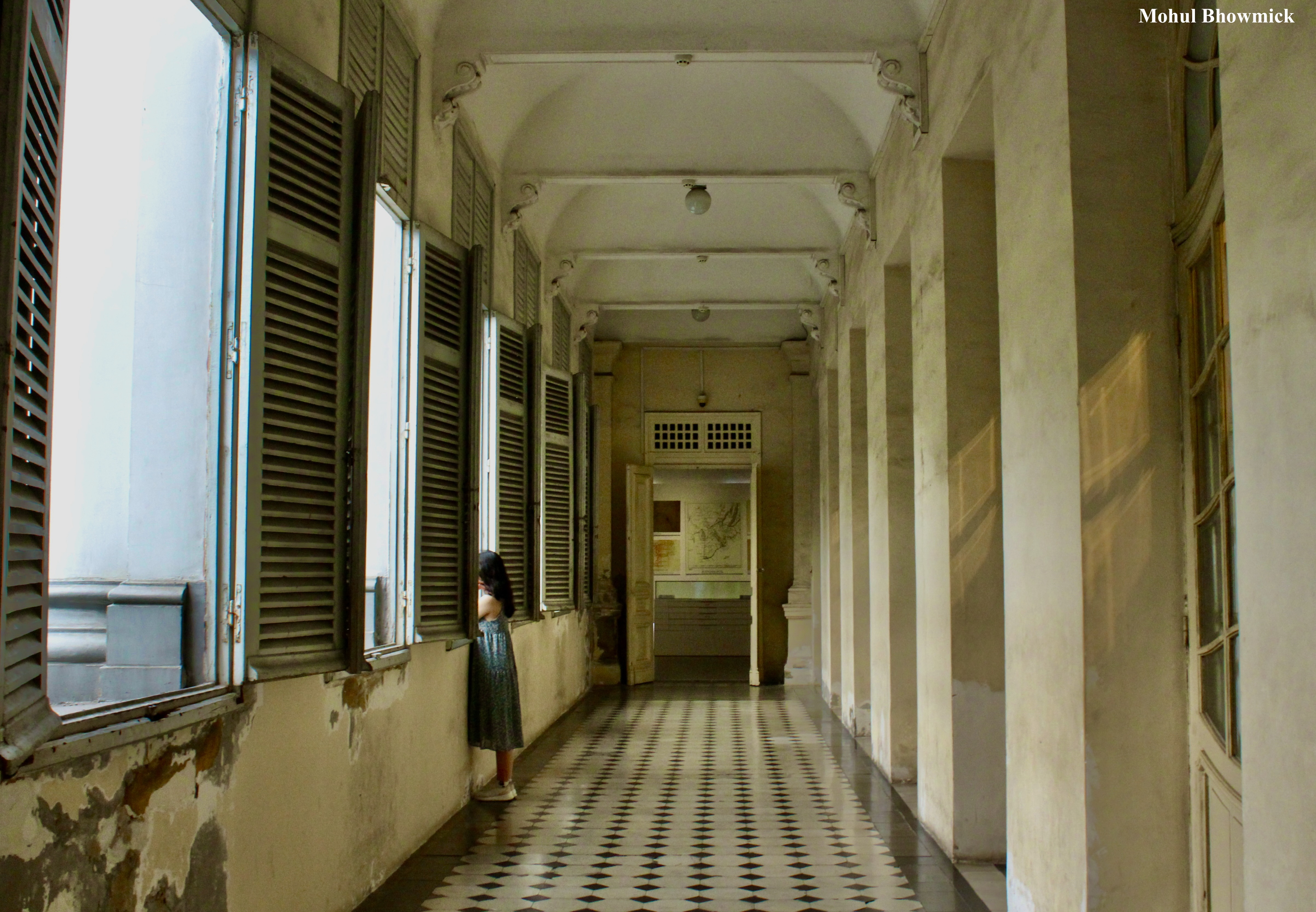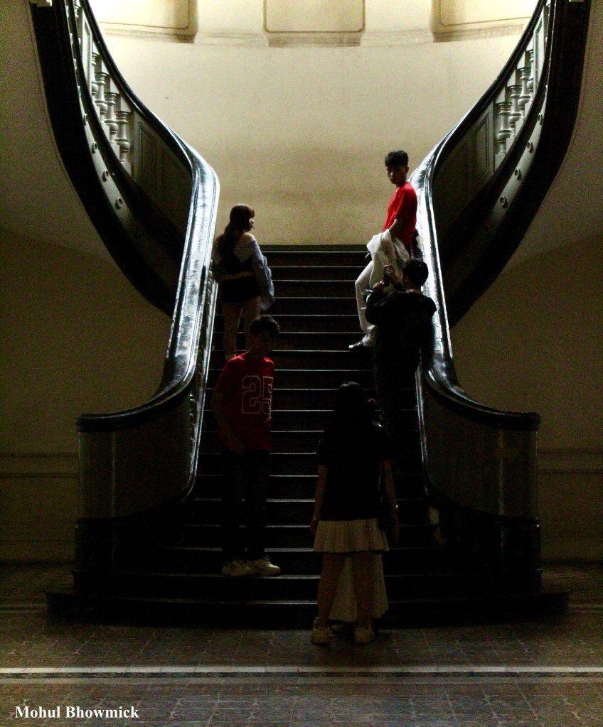 Waiting for a chance to go up the rounding stairs inside the museum in Saigon.